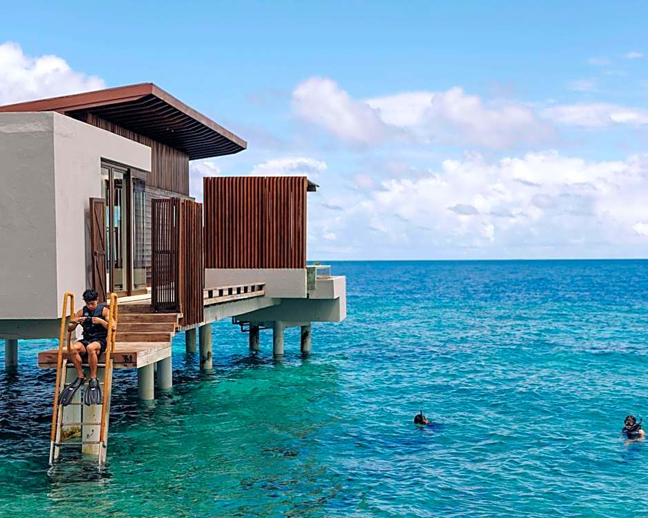 The water villas with ocean vistas feature a king bed, indoor bathtub, private deck with plunge pool, semi-submerged sun beds, outdoor bale and individual access to the reef.